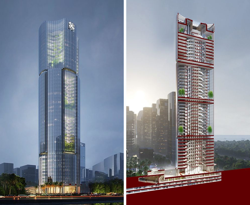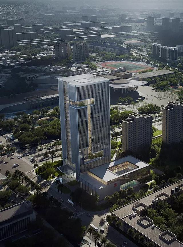台中商业银行企业总部“台中之钻”位于台中市商业中心,高200米,由Aedas公司设计。建筑概念以台中商业银行的“中”字为基础,设计避免采用将所有大型功能区堆叠在单一塔楼中的做法,而是打造了两座“分离”的塔楼,并在中间设置垂直空间将其连接并容纳大型设施。该设计将一系列“漂浮”的透明玻璃盒子置于两座塔楼间的空间中,以容纳如展览区域、空中花园、会议设施、宴会厅及游泳池等多种业态功能。