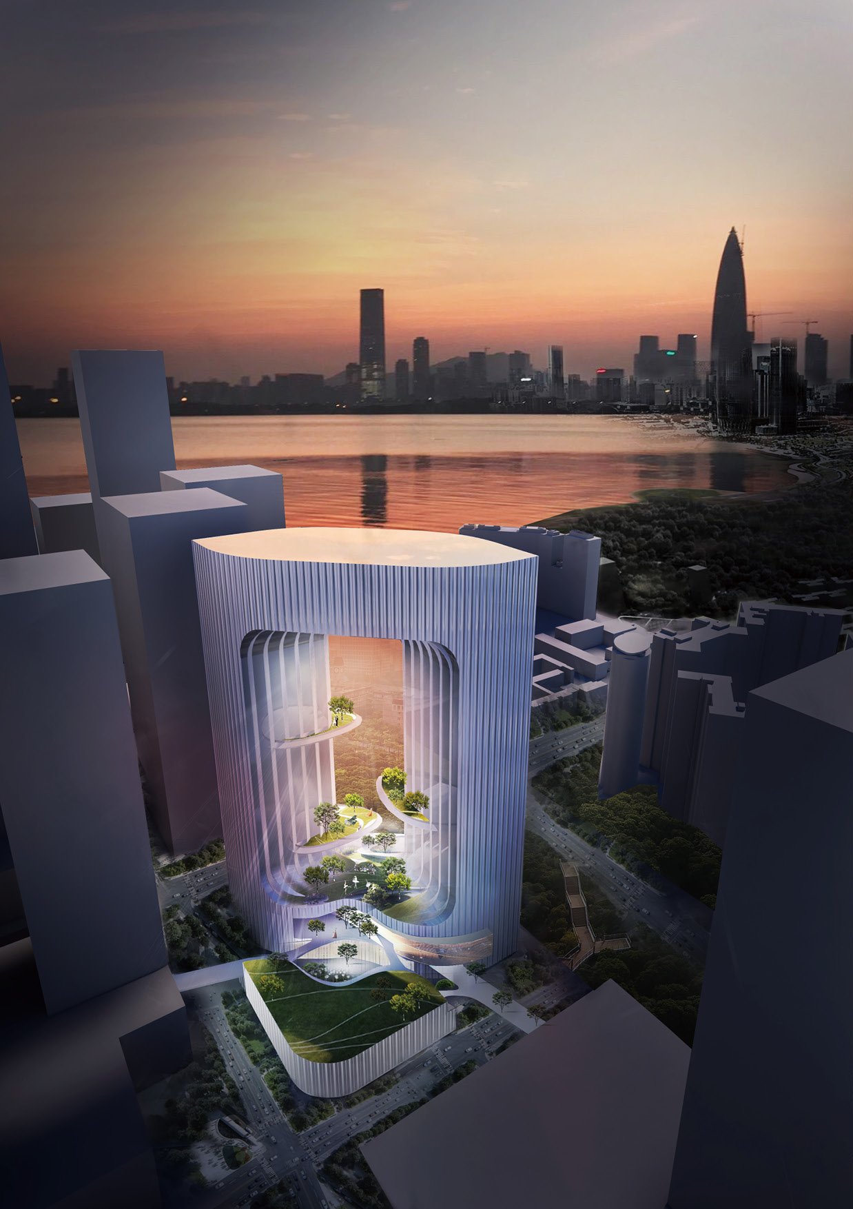 中标方案由四个互通的塔楼组成,共计42层,高度可达200米。互通的四座塔楼中,有两座塔楼呈现出灵活开放的空间状态,并由一个20层高的垂直大堂相连;而剩余的两座外部塔楼,则主要用于提供包括垂直交通在内的各项基础服务所需。此外,为了尽可能地增大其对于深圳湾的观景视野,建筑师还于较低处将塔楼向内进行了锥形倾斜的调整,以创造更大的街道城市空间。
