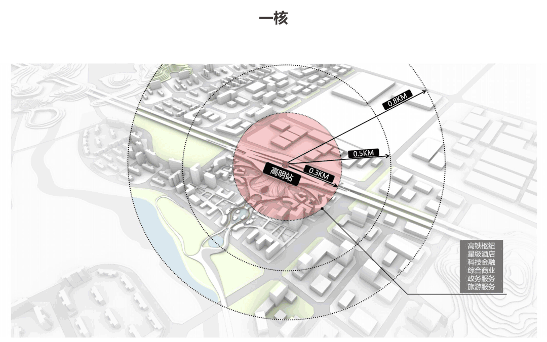 “一核”:以高明站核心枢纽,建立站城一体开发思路,打造区域核心。
