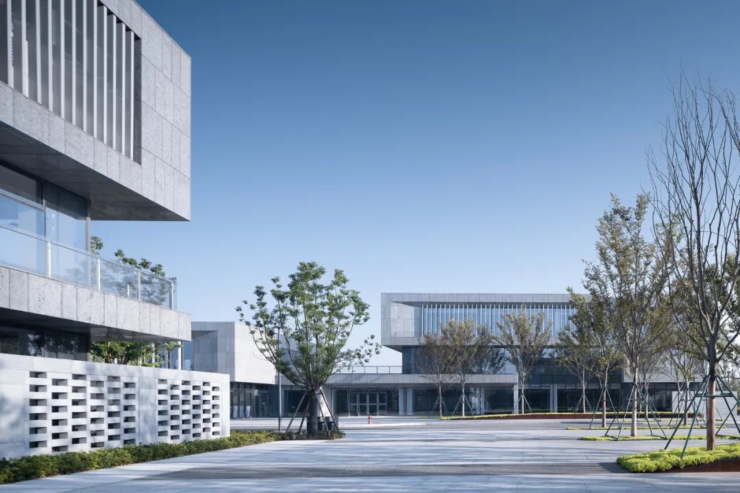 中区东南侧以及西区组团是定制的企业总部,设计通过或围合或连续的建筑体量以及石材、金属或玻璃等材料,打造独立的企业形象。