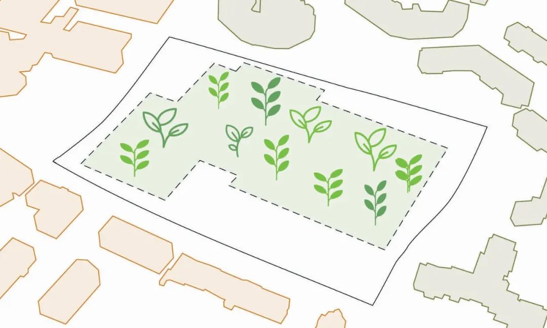 HPP计划对原建筑进行拆除回收后首先在基地上种植大量特色绿植,将此地块以一个生机盎然的绿化公园形象对外开放。不仅可以大幅减少动工时期的碳排放,并且有助于打破此地块在社区居民心中曾经封闭死板的印象,从而充分引起人们对该项目未来发展的极大兴趣。