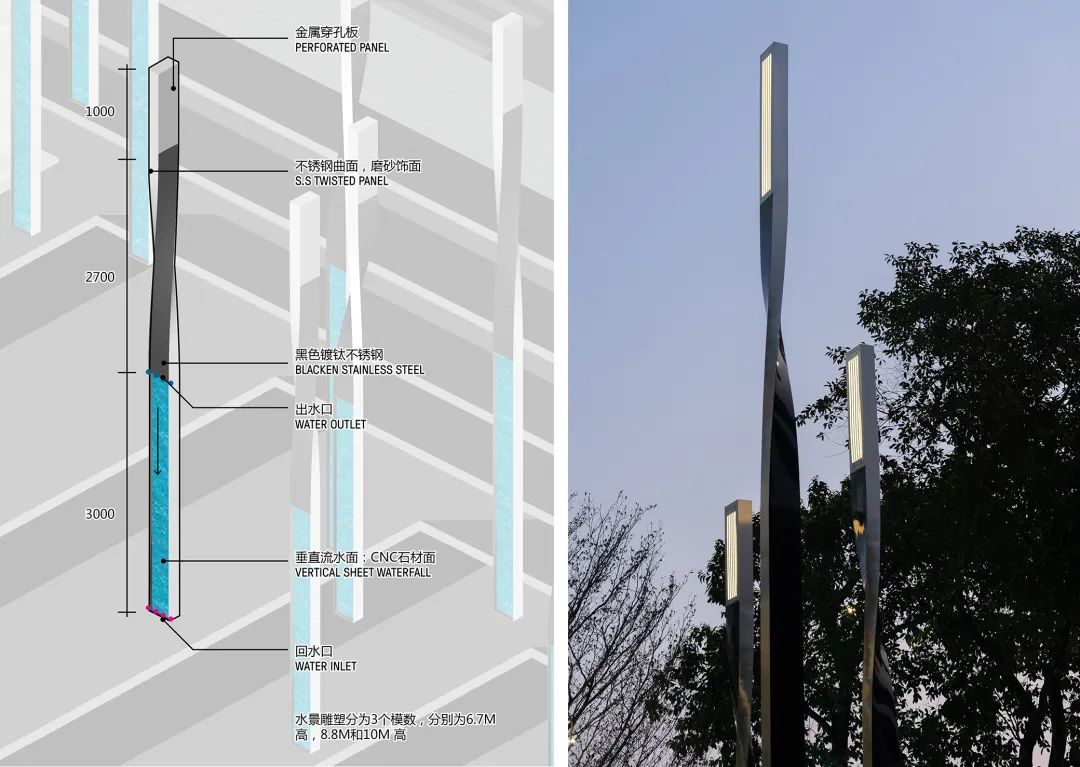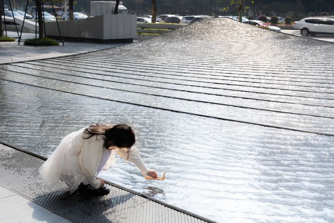 在北塔楼的西侧,无论进出万科中心还是经过人行道的人,都能看到这一处的水景立柱,如舟之楫。在流线型扭转的柱子里,可以看到源源不断的水流,隐约听见船桨划过江面的声音。垂直落下的水帘也提供了市民游憩互动的机会,配合铺设在地面的水景,这些独特的水景立柱不仅提供了空间边界的示意,也让场地的角落更加生动。