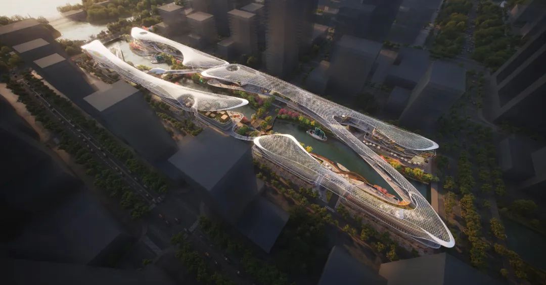 杭州,因水而兴,凭水而盛。24h不间断的城市律动,宛如钱塘之水,川流不息。项目借水之形韵,以舒展的水之天幕串联起十二个地块,打造标志性的“第五立面”;借水袖舞动之姿,以两座跨河人行桥贯通南北两岸的滨水商业,使商业流线成为完整闭环;借江南水岸建筑之韵律,提炼视觉精华,打造具有文化价值的商业立面。