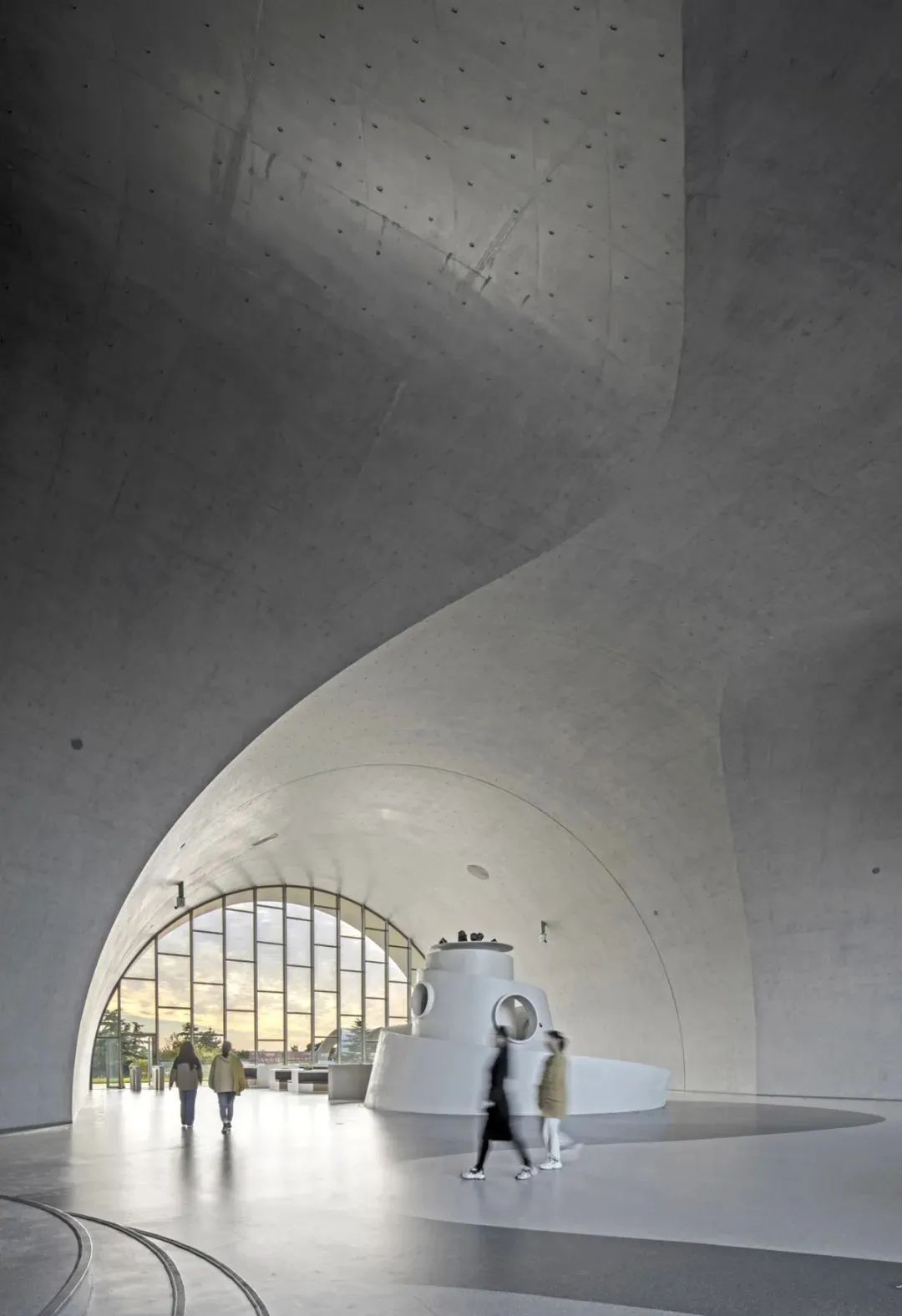 首层拱壳包裹腔体,顶层拱肋层层错叠,两层空间上下叠加并相互连通,形成了由实到虚的连续空间体验。不同方向的界面皆以清水混凝土极简的形态和温润的色彩互为延展,各功能之间也以此保持着具有立体感的联系,人们既可以从不同方向进入首层大厅,亦可以穿过不同位置的洞口登上屋顶花园。