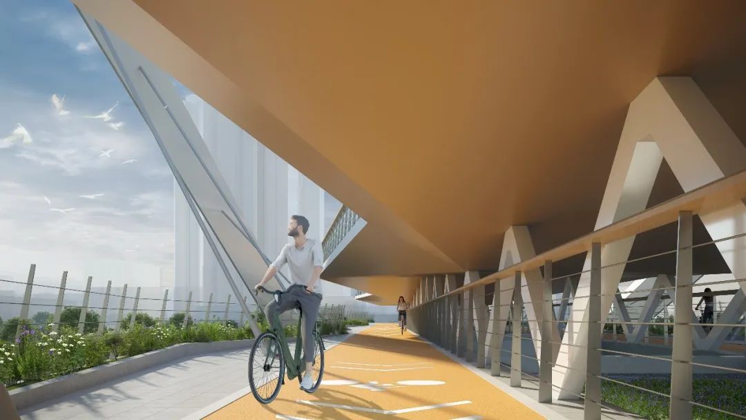 概念方案将人行与自行车通行分为上下两层。一层是自行车通行区域,在为自行车通行提供便利的同时,也为该区域预留了一部分观景空间。