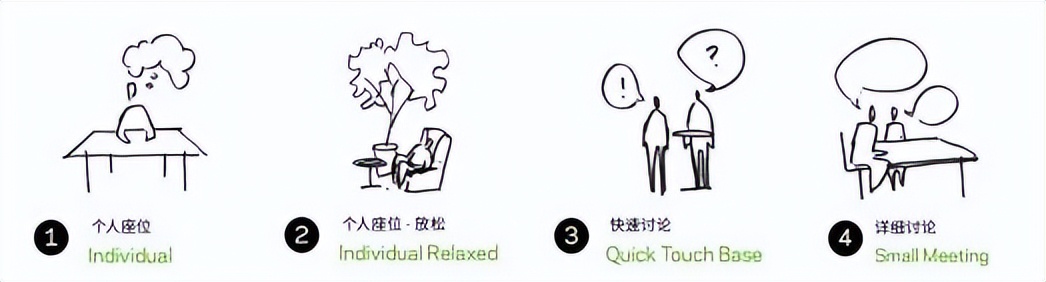 灵活布局:将标准层的楼板划分为有效的活动区域。根据中庭的大小和距离远近,我们可根据不同的工作任务进行分类:个人办公桌、身份认同区、休闲区、不期而遇和协作区块。