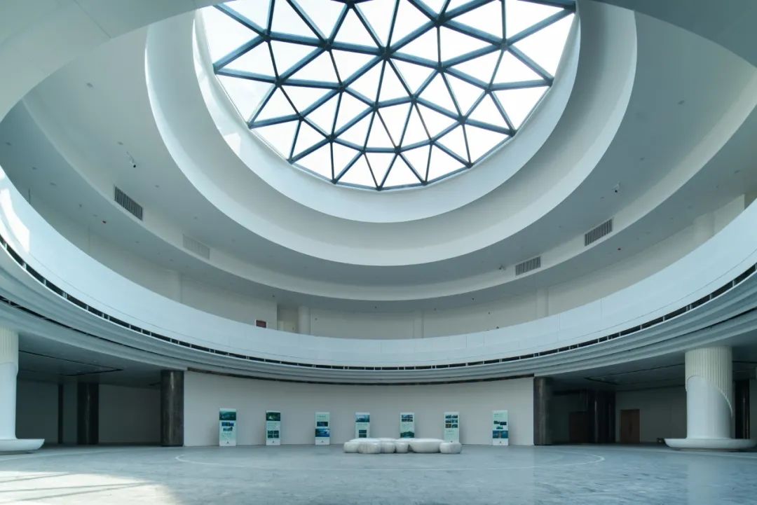 花心处向下放射出钢梁,连接到钢柱支座处,以抵消对柱顶的推力。并在周边形成较大的空间,以确保内部环境顺畅的流动感,进一步增强了建筑形体的轻盈感。