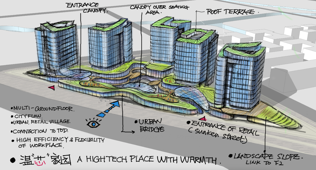 项目位于上海浦东周浦镇,占地面积近5万平方米,查普门泰勒的概念设计方案以“芯办公”、“芯购物“与”芯生活“为设计策略,打造了一个集多元办公、复合商业与生态纽带为一体的社区综合体。