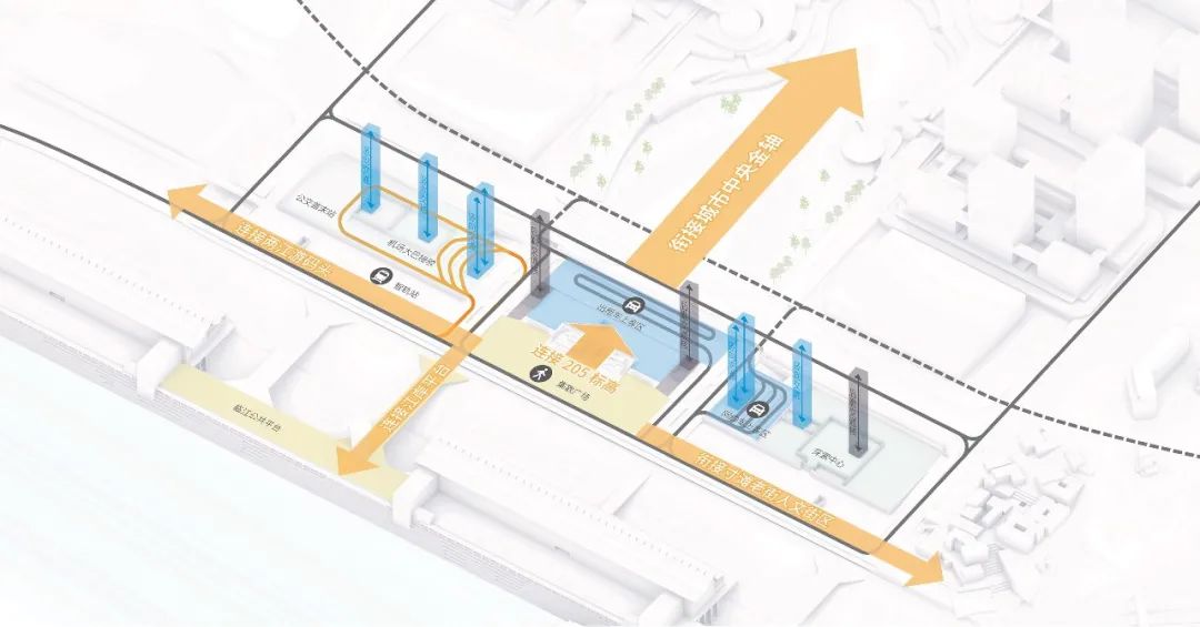 195标高平台主要承担交通集散功能,北接城市地下道路、南接横四路,整合公交、机场巴士、的士和网约车等,形成综合交通接驳枢纽,通过扶梯电梯便捷联通邮轮中心出发及到达大厅。