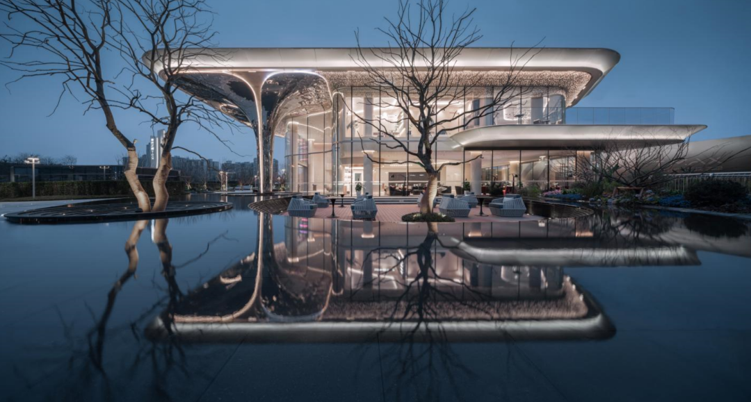示范区位于南区,启发于“自然生长”的概念,以一朵巨大的“山城之花”绽放于巨大建筑灰空间中。在此主题造型的设计落地过程中,设计方与施工方在施工方案、材料选样、试样打板上多次研发讨论,最终确定采用镜面不锈钢材料,以无缝3D整体成型手法,为整体项目增添了几分未来科技感。