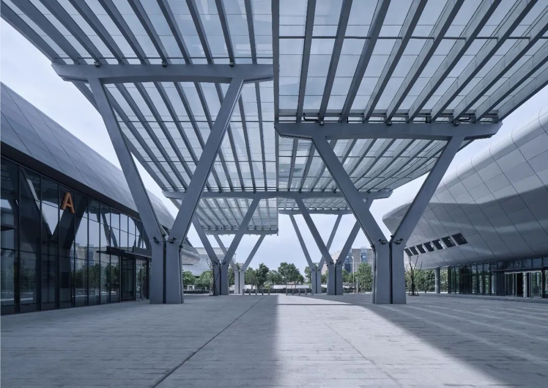 场地位于博览片区的城市中轴绿带上,为了延续这条绿带的城市公共性,结合城市中轴线设计,设置了一条贯穿南北向的室外生态走廊作为连接展厅、会议中心和室外展场的中央步道,同时还是一个活动聚集带,为城市的各种活动提供了舒适的公共空间。设置了浅水池、绿植景观和座椅等设施,营造出自然亲切的空间尺度,调节了中廊空间的微气候,减少了工程造价及运营维护费用。
