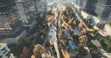 以一条清晰的城市绿洲为主轴,城市功能容纳其中