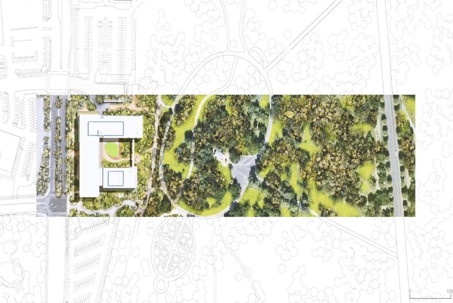这座建筑是围绕着一个种植了本土物种的庭园而设计的。人们可以通过采石场路进入庭院,并通过连接的小径直接通往植物园。可以俯瞰庭院的走道提供可以从室外直接进入翼楼的通道。连桥横越庭院的边缘。