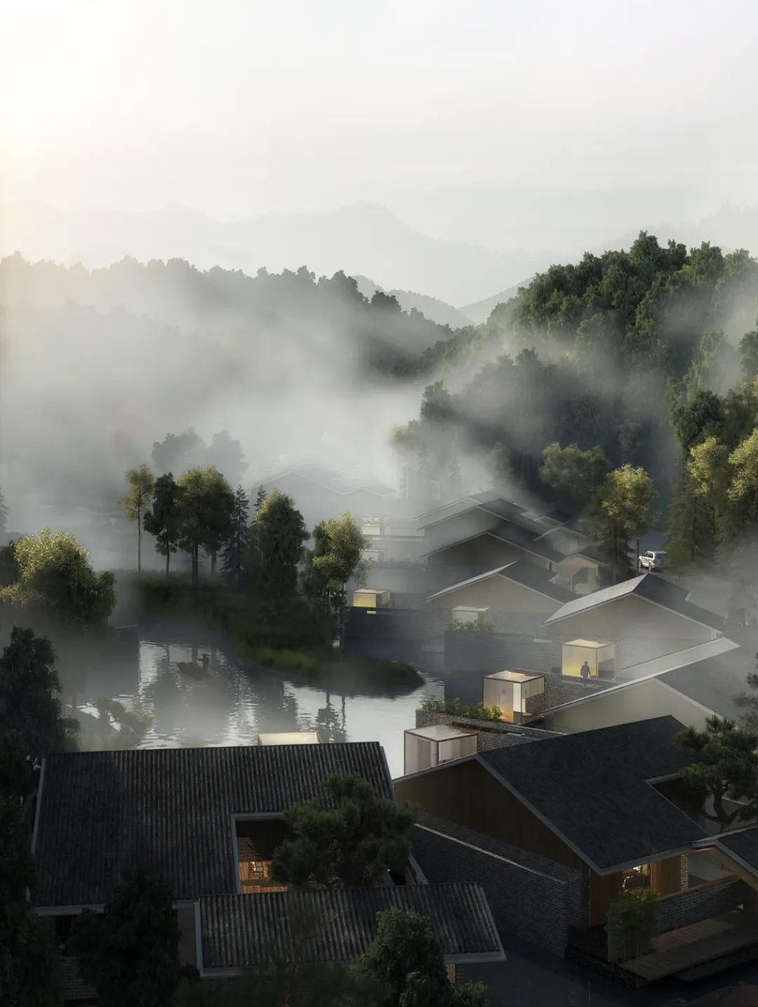 项目结合环湖场地的特质变化,提供了如传统集中式的客房、连排的汤屋、临湖的独栋等丰富的客房类型;公共空间的设计将对称式的仪式感与前场的庭院式景观相结合,移步异景,通过墙体的转换和院落的不断叠合,私汤,戏台,游廊的穿插以及对于建筑室内景观等多重界面的打破与融合,将一系列具有中国当代语境的空间置于山水之中。