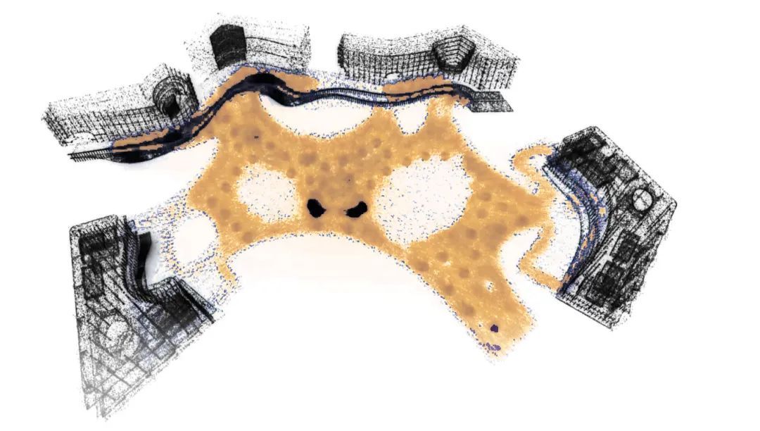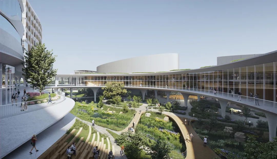 概念方案在地块内的水系景观表现上也独具匠心。如同乐谱一般,每条水路都通过其各异的性格、流速和韵律在地块中呈现出空间和环境的变化。水系路径反映了沿途生态活动的积极性和生命力,同时也是雨水收集策略的重要一环。上述设计手法不仅为喜爱淡水的动植物创造了微观栖息环境,同时也创造了供人们休闲娱乐的水景步道。