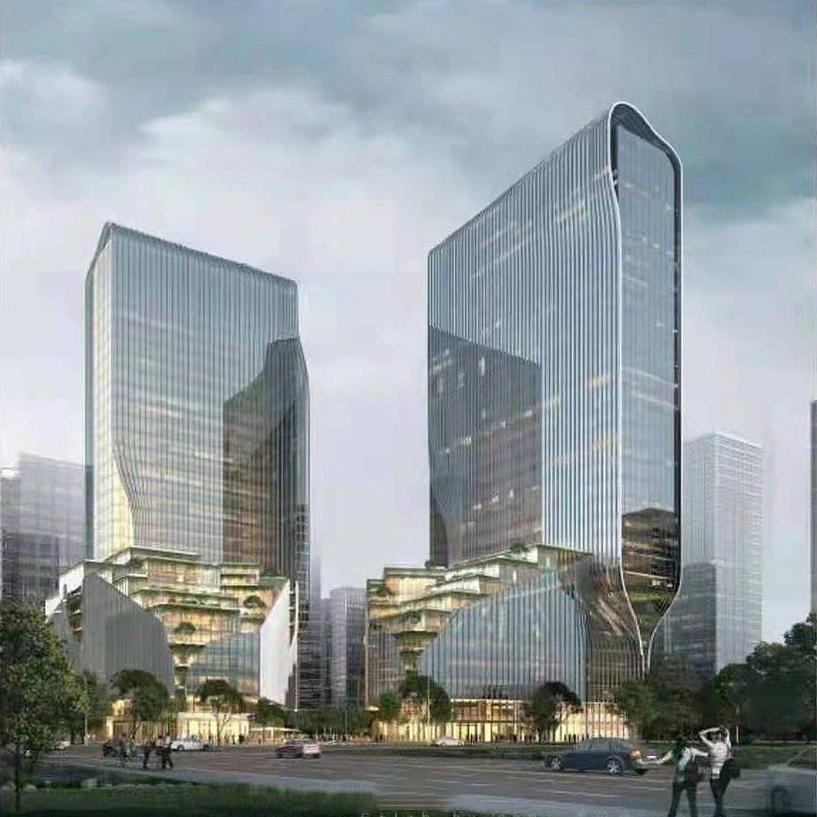 项目主体为两幢高约145米的建筑,外形不同于普通的盒装玻璃幕墙建筑,搭配有流线型线条,使建筑造型更具韵律,富有“跳动”感。