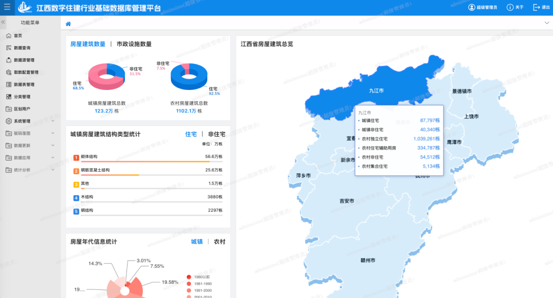 2024年,住房城乡建设部发布《“数字住建”建设整体布局规划》,强调以“四好”建设为主线,以数据资源为核心,全面推动住房城乡建设领域数字化、智能化转型。江西省住房和城乡建设厅深入贯彻落实住房城乡建设部关于“数字住建”建设有关要求,结合《江西省数字政府建设总体方案》,制定了《江西省“数字住建”建设三年行动计划》,提出“1+2+N”的江西省“数字住建”架构体系,即省住建大数据中心,城市信息模型(CIM)基础平台+建筑信息模型(BIM)技术应用,大力推进数字工程、数字住房、数字城建、数字城管、数字村镇、数字审管6个主要板块建设;提出到2025年底,夯实开放共享的数据资源体系,构筑可信可控的信息安全保障体系和先进适用的标准规范保障体系,全省住建领域应用数字技术能力达到领先水平,实现全省住建领域各行业“统一平台、数据共享、协同高效”。截至目前,江西省“数字住建一期”平台已建设了住建大数据中心,完成了CIM平台以及BIM平台的建设,以高质量数据集推动江西省住建领域数字化建设取得显著成效。 突出顶层设计,统一数据标准规范 制定统一的数据元交换、共享应用等核心标准,规范业务术语、字段定义、编码规则,实现跨系统、跨部门数据“语言”一致。建立覆盖数据采集、存储、使用、销毁全生命周期的标准规范体系,明确质量指标、安全要求与操作流程,实现治理全域标准化。统一元数据管理规范,梳理数据血缘关系,构建集中化元数据仓库,让数据来源、流转路径可追溯、可理解。 江西数字住建行业基础数据库管理平台界面 夯实数字底座,强化基础支撑能力 全量覆盖,做好业务数据统一汇聚。住建大数据中心对数字住建所有业务系统实行数据库集约化部署,统一分配数据库资源、账号权限,实现对所有数据库的统一纳管,强化数据操作的监管效能。目前,已完成4个功能模块的数据库管控工作,分配了数据库各类账号4个,完成了4099个生产系统数据表、涉及76129个数据项的统一纳管,汇聚了企业、人员项目等各类数据,实现了对数据的集中汇聚、动态更新。 层次分明,构建数据资源基本体系。探索数据分级分类,形成住房和房地产数据等5个一级类别,房屋建筑数据等10余个二级类别,梳理形成动态更新的数据资产一本账,构建数据资产目录管理体系,有效支撑跨层级、跨地域、跨系统、跨部门、跨业务的数据有序对接、高效流通、动态更新和共享应用。目前已完成项目、企业、人员、房屋等7个基础库,市场监管、质量安全、城市管理、公积金监管等12个主题库,人员实名制、进赣企业、传统村落、公园等24个业务库的建设,汇聚3.85亿个数据集。 价值跃迁,推进基础数据治理增效。一是实施企业人员基础数据实名制。全面对接工商登记信息,确保从业企业信息真实可靠,开展从业人员实名制登记,建立从业人员聘用关系管理机制,目前,已建立涵盖企业56401家、1941747人的基础数据库。二是完善了房屋市政基础数据。基于房屋和市政设施灾害普查数据,归集江西省房屋建筑以及市政设施基础数据,包括市政道路7118条、农村独立住宅1015422栋、城镇非住宅房屋387862栋、城镇住宅843649栋。同时通过大数据中心实现与各地房屋信息平台、工程建设项目审批系统管理平台互联互通,实现房屋数据的实时更新。三是全面梳理工程建设项目涉及的工程审批、施工图审查、项目招投标(项目发包)、施工许可、消防审验、质量安全监管、项目验收以及参建单位和人员信息,建立各环节数据衔接关键要素,实现了从立项、报建、施工到竣工的全链条数据贯通。 普惠互利,畅通全省数据共享渠道。统筹推进全省住建部门数据共享工作,打造数据共享协同中心,积极对接省政务数据统一共享交换平台,梳理整合对外数据共享情况,实现一次订阅、全厅共享,发布接口1930个、库表资源2267个,第三方累计申请超9次、调用约19万次、库表交换700余万条。规范数据订阅、发布管理,制定省、市两级数据共享审批工作流程,提升数据共享效能,确保数据共享工作及时、准确、合理。 平台筑基,做强共性应用支撑底座。依托赣政图提供的GIS(地理信息系统)基础数据,建设了全省统一的城市信息基础(CIM)平台,形成了丰富多元的能力组件中心,目前已接入10项内部的能力组件和第三方能力组件。能力组件中心为全省住建应用系统提供能力调用,调用量突破15万余次。各业务系统通过一站式、统一标准化的能力组件接口申请调用,在开发成本方面减少20%以上。 江西省数字政务决策指挥平台界面 释放数据价值,强化应用效能 支撑有力,驱动行业监管决策。构建江西省住建领域领导驾驶舱,依托“数字政府大脑”平台,推进政务数据分析、挖掘工作,梳理了经济运行、安全运行、人才建设、城乡治理、政务服务5大板块200余个指标,对网签房地产市场交易面积、金额,商品住宅存量信息,公积金缴存提取等数据进行分析。探索住建领域公权力大数据监督,进一步强化与发展改革、市场监管、公安、税务、财政等部门数据对接,构建工程建设领域全过程“监督数据仓”。 “数智六化”,推进工程项目审批提质增效。一是申报材料无纸化。全面实现电子签名、电子印章、电子材料在工程建设项目全流程网上办理过程中的场景应用。二是部门证照电子化。积极推进工程建设